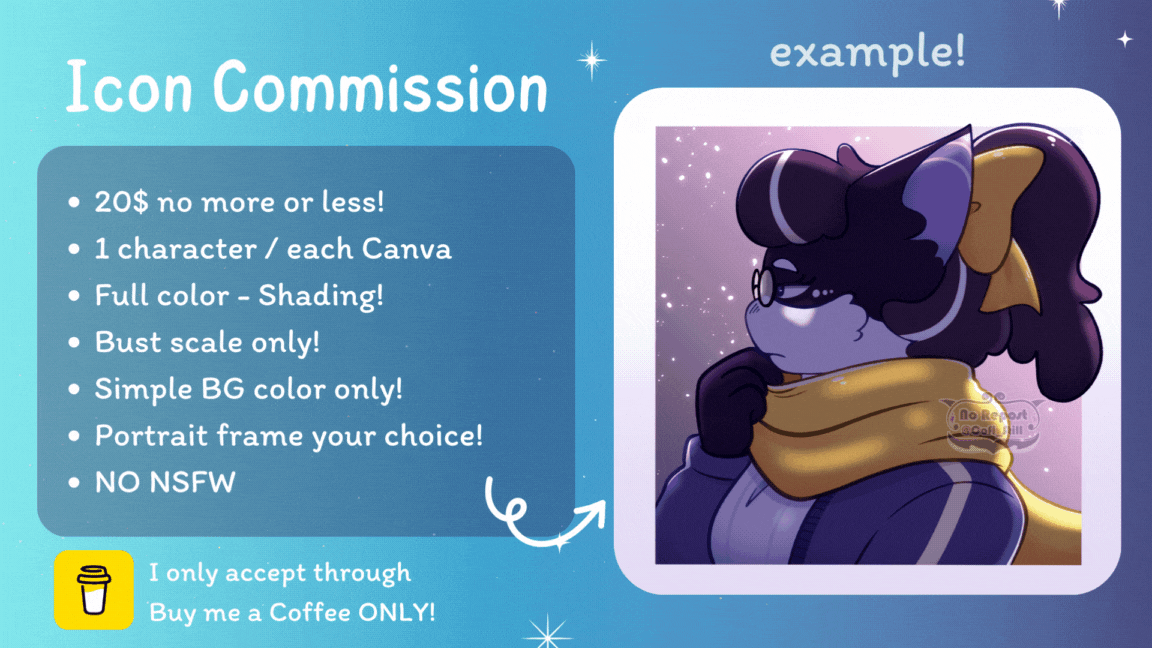 •If you want to commission me, come to DM me first! Please wait until I reply if the slots are available or not, so you can brief the details you want after that. And I'll make my own decision to accept the work or not.•If I accept, I'll start the first rough sketch ASAP to let you check.•If you are satisfied with the rough progress, you can pay the first half of the price I summarized. Then I'll start the next progress.•Pay me through Paypal, Ko-fi or Buy me a coffee!•You can't ask me to change the pose or the whole art after the clear sketch progress has been done, or you have to pay more.•I'll send every progress to let you check if it's okay, clear sketch - line up - base color - full shading. If you do not respond, I won't continue because I have to make sure that the progress I'm making is perfect for you enough or not.•Make sure when you ask me to fix something, I still making that progress, you shouldn't ask me to change the base color after I finish the shading, or change some accessories or clothes after the lineup is done.•After I finish, I'll send the last progress with a watermark to let you check.•If you're satisfied with all of them, you have to pay the rest before I send the full complete one through email.